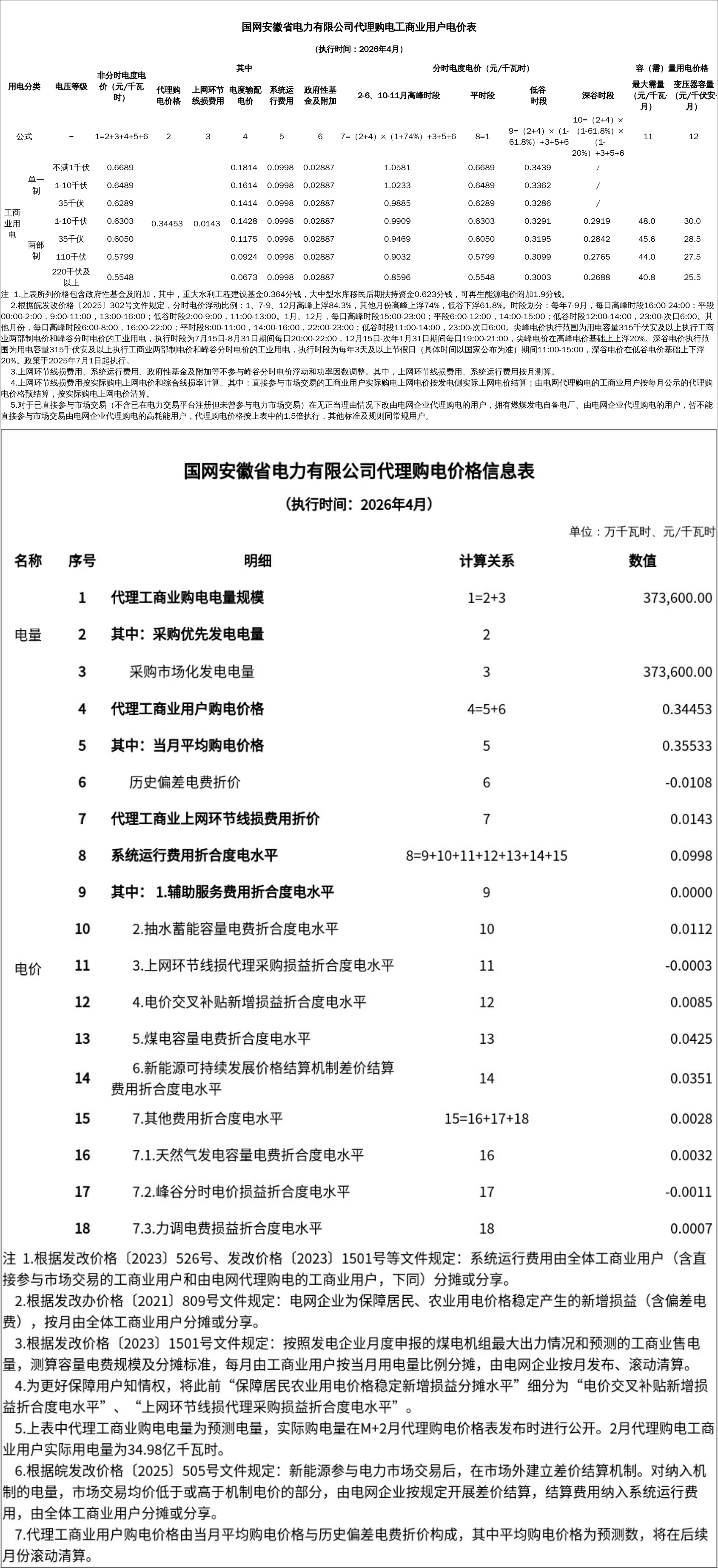 | 注 1.上表所列价格包含政府性基金及附加,其中,重大水利工程建设基金0.364分钱,大中型水库移民后期扶持资金0.623分钱,可再生能源电价附加1.9分钱。 2.根据皖发改价格〔2025〕302号文件规定,分时电价浮动比例:1、7-9、12月高峰上浮84.3%,其他月份高峰上浮74%,低谷下浮61.8%。时段划分:每年7-9月,每日高峰时段16:00-24:00;平段00:00-2:00,9:00-11:00,13:00-16:00;低谷时段2:00-9:00,11:00-13:00。1月、12月,每日高峰时段15:00-23:00;平段6:00-12:00,14:00-15:00;低谷时段12:00-14:00,23:00-次日6:00。其他月份,每日高峰时段6:00-8:00,16:00-22:00;平时段8:00-11:00,14:00-16:00,22:00-23:00;低谷时段11:00-14:00,23:00-次日6:00。尖峰电价执行范围为用电容量315千伏安及以上执行工商业两部制电价和峰谷分时电价的工业用电,执行时段为7月15日-8月31日期间每日20:00-22:00,12月15日-次年1月31日期间每日19:00-21:00,尖峰电价在高峰电价基础上上浮20%。深谷电价执行范围为用电容量315千伏安及以上执行工商业两部制电价和峰谷分时电价的工业用电,执行时段为每年3天及以上节假日(具体时间以国家公布为准)期间11:00-15:00,深谷电价在低谷电价基础上下浮20%。政策于2025年7月1日起执行。 3.上网环节线损费用、系统运行费用、政府性基金及附加等不参与峰谷分时电价浮动和功率因数调整。其中,上网环节线损费用、系统运行费用按月测算。 4.上网环节线损费用按实际购电上网电价和综合线损率计算。其中:直接参与市场交易的工商业用户实际购电上网电价按发电侧实际上网电价结算;由电网代理购电的工商业用户按每月公示的代理购电价格预结算,按实际购电上网电价清算。 5.对于已直接参与市场交易(不含已在电力交易平台注册但未曾参与电力市场交易)在无正当理由情况下改由电网企业代理购电的用户,拥有燃煤发电自备电厂、由电网企业代理购电的用户,暂不能直接参与市场交易由电网企业代理购电的高耗能用户,代理购电价格按上表中的1.5倍执行,其他标准及规则同常规用户。